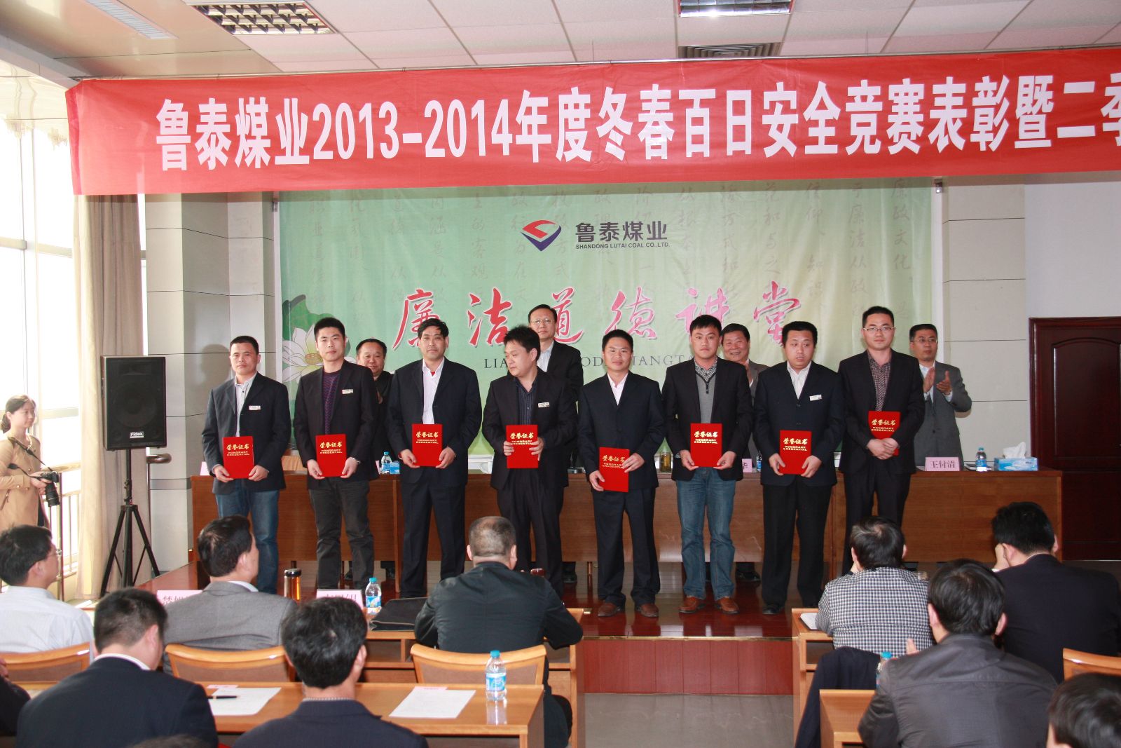 公司总经理李合军出席会议并作重要讲话。会议由副总经理薛培华主持。副总经理关延忠总结了冬春百日安全竞赛活动开展情况,简要概括了一季度开展的重点工作,并对二季度安全生产工作重点进行了安排。副总经理王付清宣读《山东鲁泰煤业有限公司关于对"13-14年度冬春百日安全"竞赛活动进行总结表彰的通知》。