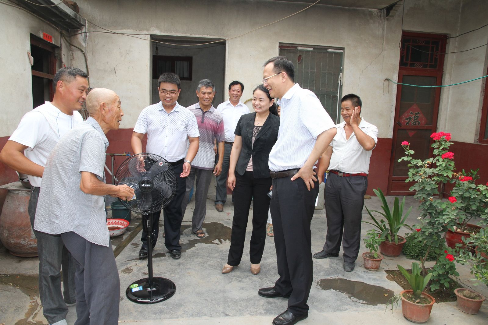 李合军先后到孔祥金、孔凡连、徐如东等老党员家中,向他们致以节日的问候,并送去电风扇,让老党员们在酷热的夏天感受到凉爽。